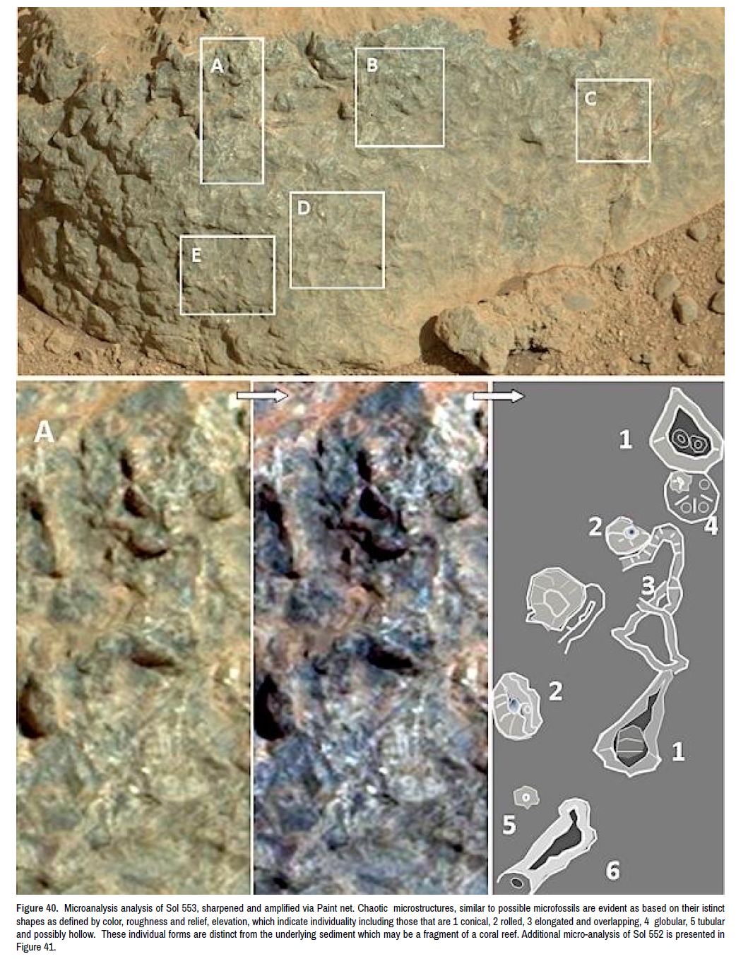 A major focus of this report is a fragment of sediment (Sol 553), resembling a carbonate rock, which, on the basis of the observable texture and the large amount of allochems could be part of or related to a coral reef (Figures 1,41)- -and in other areas of Mars what may be the remnants of coral reefs have been detected [4]. A microanalysis analysis of the image, sharpened and amplified in size via Paint net program (Figures 41,42), shows a chaotic set of microstructures, similar to possible microfossils.