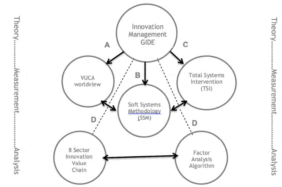 Several empirical studies [12-14] over the last decade continued to prove the value of some form of a multi-level approach to the complex phenomena of innovation by holistically looking at macro and micro factors across theory, measurement and analysis. In truly understanding the complexity of such a phenomenon the organizational dynamics and how-to better cascade innovation in practice successfully at an operational, tactical and strategic level is a critical success factor. To this point this methodology chapter integrates multi-theories of innovation management into one empirical design map (Figure 1) incorporating theory, measurement and analysis underpinning the game changing innovation development ecosystem (GIDE) with the VUCA model, Soft Systems Methodology (SSM) and Total Systems Intervention (TSI). This empirical map will be discussed and explored further throughout this chapter.