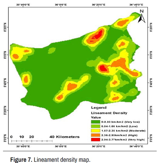 Lineament density: Lineaments are tectonic-derived linear, rectilinear, and curvilinear features that are visible in satellite photography. These lineaments typically display linearity and curvilinerities in vegetation, drainage, drainage patterns, soil tonality, relief, and tonality in soil in satellite data. In particular, in the lineaments that are not filled by soil, the lineaments may operate as a channel for water to seep into the earth and migrate through the aquifer system due to linear features including fault, fractures, and geological connections between various lithologies. Since it is assumed that the rate of water infiltration increases with increasing lineament density, the lineament density (Figure 7) of a region might indirectly indicate the groundwater potential. These lineaments are mapped with the help of satellite data and can be correlated with faults, fractures, joints, bedding planes and geological contacts which are useful for the groundwater potential study.
