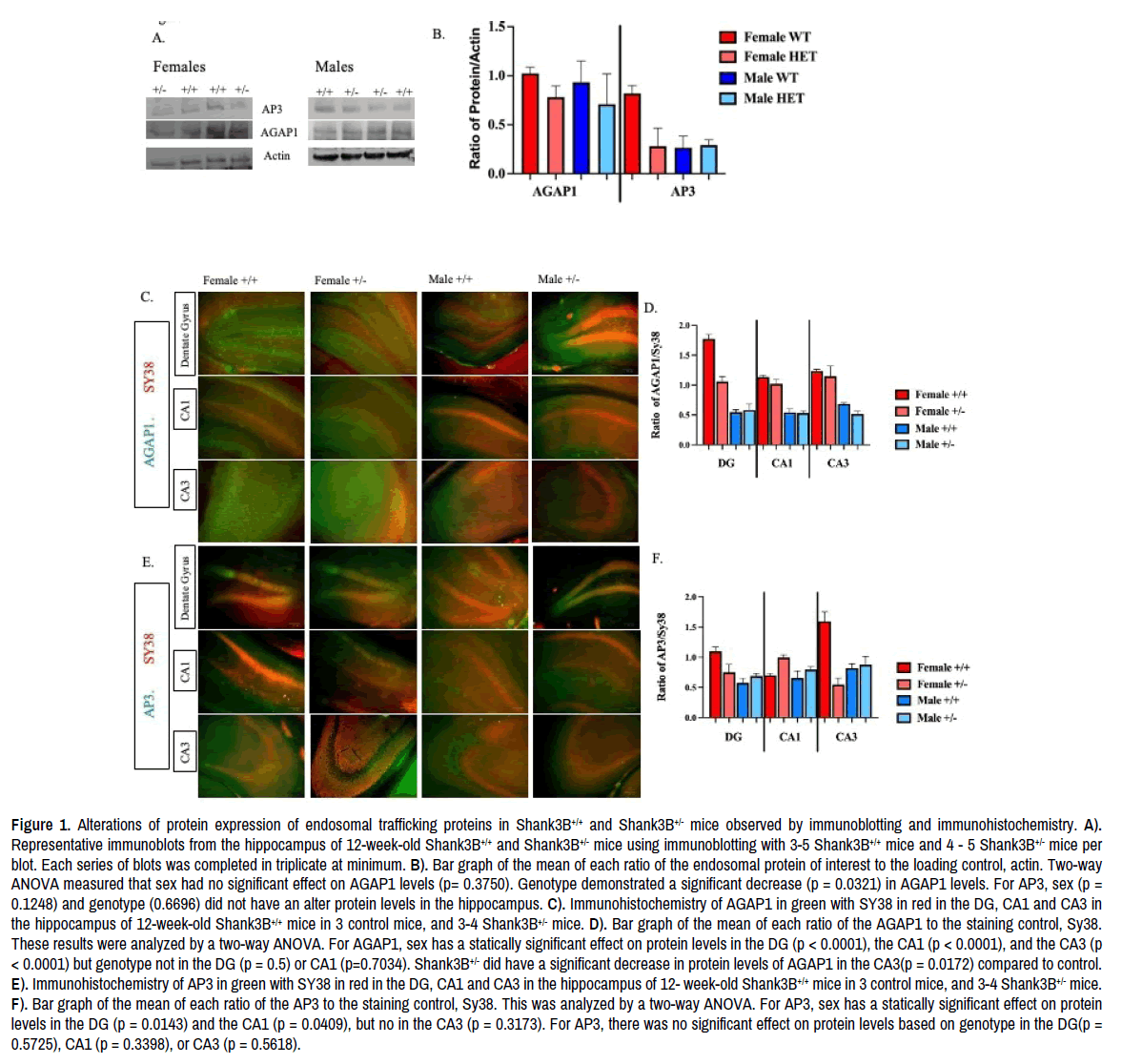 Endosomal pathways regulate the trafficking of neurotransmitters and receptors throughout neurons as well as regulating proper dendritic morphology. AGAP1 and AP3 are part of the endosomal machinery that regulate proper dendritic spine morphology. To gain a deeper understanding of the role of endosomal trafficking in neurodevelopment in a sex-dependent manner, we analyzed the protein expression using immunoblotting and immunohistochemistry of the hippocampus in a sex-dependent manner using a Shank3B heterozygote mouse model, which better aligns with clinical observations.