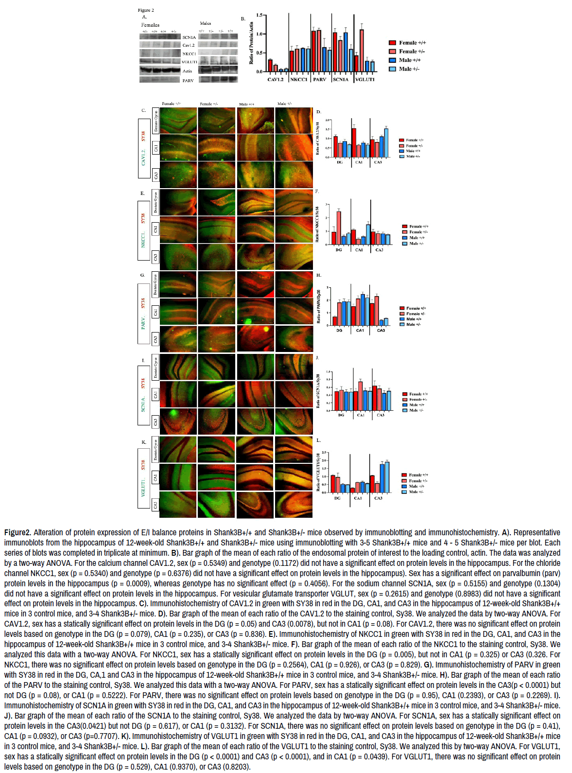 Next, we analyzed E/I protein levels in a region-specific manner using immunohistochemistry in the hippocampus of 12-week-old shank3b+/+ and shank3b+/- mice (Figure 2C-L). To quantify changes observed in staining, we determined the fluorescent intensity of our protein of interest relative to that of synaptophysin to create a ratio. For CAV1.2, sex has a statistically significant effect on protein levels in the DG (p = 0.05) and CA3 (0.0078), where CAV1.2 was higher (on average) in the females in the DG and in the males in the CA3, but not in CA1 (p = 0.08). For CAV1.2, there was no significant effect on protein levels based on genotype in the DG (p = 0.079), CA1 (p = 0.235), or CA3 (p = 0.836). For NKCC1, sex has a statistically significant effect on protein levels in the DG (p = 0.005), where NKCC1 protein levels were higher in the females, but not in CA1 (p = 0.325) or CA3 (0.326. For NKCC1, there was no significant effect on protein levels based on genotype in the DG (p = 0.2564), CA1 (p = 0.926), or CA3 (p = 0.829). For PARV, sex has a statistically significant effect on protein levels in the CA3(p < 0.0001) where PARV protein levels were higher in the females, but not DG (p = 0.08), or CA1 (p = 0.5222). For PARV, there was no significant effect on protein levels based on genotype in the DG (p = 0.95), CA1 (0.2393), or CA3 (p = 0.2269).