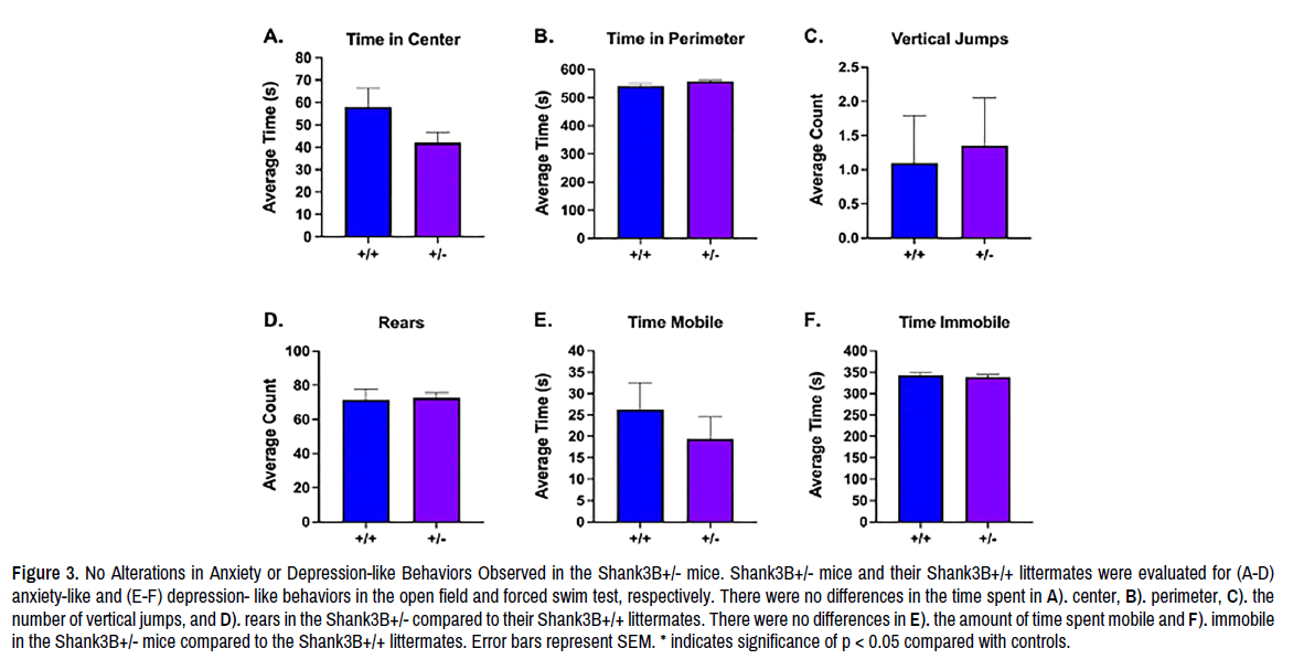 Figure 3. No Alterations in Anxiety or Depression-like Behaviors Observed in the Shank3B+/- mice. Shank3B+/- mice and their Shank3B+/+ littermates were evaluated for (A-D) anxiety-like and (E-F) depression- like behaviors in the open field and forced swim test, respectively. There were no differences in the time spent in A). center, B). perimeter, C). the number of vertical jumps, and D). rears in the Shank3B+/- compared to their Shank3B+/+ littermates. There were no differences in E). the amount of time spent mobile and F). immobile in the Shank3B+/- mice compared to the Shank3B+/+ littermates. Error bars represent SEM. * indicates significance of p < 0.05 compared with controls.