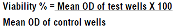 Cytotoxic effect of differnet concentrations of AgNPsandAgNPH2O2 was determined using 3-(4,5-dimethylthiazol-2-yl) -2,5-diph enyl-tetrazolium bromide (MTT) assay, where growth medium was decanted from pre-cultured Vero cells 96-well micro titer plates. AgNPsandAgNP-H2O2were applied ata starting concentration of 100μM/ml in a series of double fold serial dilution in serum free E-MEM as 0.1 ml of each dilution/well. Negative untreated cell control was considered and plates were incubated at 37ºCfor 24 hrs. Post incubation.Plates were washed three times with phosphate buffer saline (PBS) as 250μl/well. Fifty μl of MTT solution (0.5 mg/ ml) were added as 50μl/well and plates were incubated for a further 4 hrs at 37°C. Plates were PBS washed as previousand the formed purblecolored formazan crystals were dissolved using 50 μl/wellof DMSO (Sigma Aldrich-USA).Plates were shaked for 5 mins at room temperature. Optical density (OD) was measured at 570 nm using an ELISA plate reader. The percentage of cellular viability was calculated using the following formula: