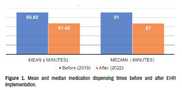 Conclusion: This study provides quantitative evidence that introducing the use of EHRs substantially improved the medication dispensing efficiency in a Saudi Arabian hospital pharmacy. Further research should assess the long-term impacts of the use of EHRs across multiple sites.