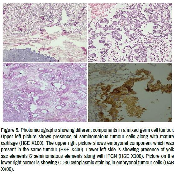 Figure 5.Photomicrographs showing different components in a mixed germ cell tumour. Upper left picture shows presence of seminomatous tumour cells along with mature cartilage (H&E X100). The upper right picture shows embryonal component which was present in the same tumour (H&E X400). Lower left side is showing presence of yolk sac elements & seminomatous elements along with ITGN (H&E X100). Picture on the lower right corner is showing CD30 cytoplasmic staining in embryonal tumour cells (DAB X400).
