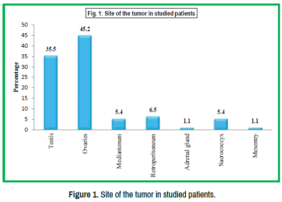 Max cases were seen in ovaries (45.2%) followed by testis (35.5%) (Figure 1).