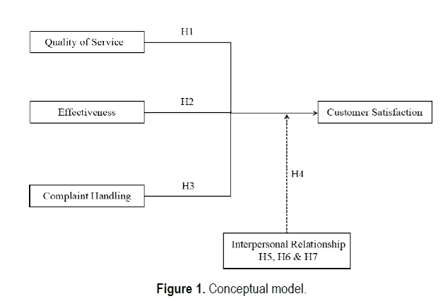 Most literature on interpersonal relationship reviewed that interpersonal relationship is one of the factor between quality of service and behavioural outcomes [19,46,47] that is it serves as an antecedent factor to customer relationships. Interpersonal relationship plays more an important role in the banking success profile especially in the customer care section. 1. It makes customers feel more connected to the bank 2. Increase high costs of switching [19], i.e. interpersonal relationship increase through face-to-face interaction with customers which graduate into feelings. Therefore, the higher the interpersonal relationship the more personal experiencees on services and contiguous receptive bodily contentment. Thus, customers received a lot of benefit from being acquainted with the process and the service providers. In most retail firms, customers are the fore-runner, the link and external representative of any customer services business. According to Ngo [48] interpersonal relationship shows a positive and significant impact and service quality also on customer loyalty and serves as full mediator for both service quality and customer loyalty. Based on interpersonal relationship, most organisations has turned to modern mode of operations, through effectiveness and efficiency service delivery to achieve better outcomes and performance. This help to enhance customer satisfaction and to constantly fulfilling and modifying customers’ needs [49], suggest that interactive effects mediate customer-oriented and personality on customer service performance and complaint-handling. Also, many authors have confirmed that interpersonal relationship can mediate the relationship between quality of service; efficiency of service; complaint handling with customer satisfaction. Specifically, some studies on [45]. Therefore, the study hypothesized that: