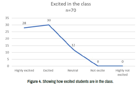 The nursing students were excited in their classroom and laboratory activities during face-to-face instruction. With the total population of seventy (70)=100%, It reveals that there are twenty-eight (28)=40% of the students was highly excited, thirty (30)=43% students excited to face to face instruction, twelve (12)=17% students responded neutral. Therefore, most of the nursing students were excited in face-to-face instruction during classroom discussions and laboratory activities doing procedural return demonstrations. They have shown involvement in discussions, they get encouraged and creative in group discussion. Most importantly, they have drawn connections in real life when assigned peer discussion and demonstration to nursing procedures (Figure 4).