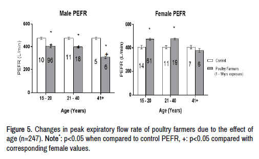 In this aspect of the study, the effect of age on PEFR of male and female subjects exposed to poultry farming for 1-10 years was determined. The data show that the PEFR of the subjects exposed to poultry farming for 1-10 years was higher in female subjects when compared to male subjects of corresponding age range. It was also observed that the PEFR of the poultry farmers decreased with increase in age especially in subjects over 40 years of age. The effects of age on PEFR poultry farmers was observed to be greater in male subjects, as it was observed that the PEFR was significantly greater (p<0.05) in the female subjects (Figure 5).