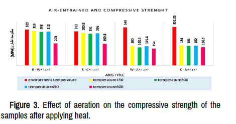 After investigating the compressive strength of two reference specimens, namely R-C and R-W, it was determined that the compressive strength of cured R-C in an environment consisting of calcium chloride and urea will start reacting 5% less than cured R-W specimen in an environment without reactants. Reduced compressive strength of R-C specimen, compared to R-W specimen, can be associated with the destructive nature of calcium chloride and urea for concrete structure. As can be seen from Figure 2, the maximum decrease in the compressive strength of the reference specimen is seen in the temperature 600°C, which is reduced by 35%-38% compared to their compressive strength in ambient temperature. Figure 3 the impact of air-entraining admixtures on compressive strength of specimens after the heating process.