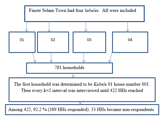 All kebeles (the smallest administrative unit in Ethiopia) of the town were included. Then determine the sampling interval (K) by dividing the number of units in the total household by the desired sample size. Total households 781/422=2, so K=2. The first sample household was selected by lottery method then the other was determined by adding k unit. When the selected households were closed during data collection, the next households were taken (Figure 1) [5].
