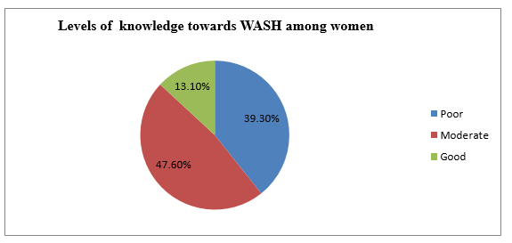 A total of twenty-five questions measuring knowledge of water, sanitation and hygiene were given to three hundred and ninety-nine women. 39.3% of the respondents were found to have good knowledge about WASH. The scores for moderate and poor knowledge were 47.6 and 13.1%, respectively (Figure 2) [10].
