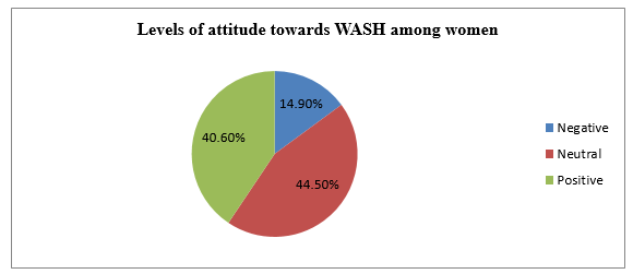 One hundred and fifty-eight women (40.6%) felt a positive attitude about WASH. Only a small percentage of women 58 (14.9%) have a negative attitude about WASH, while the majority 173 (44.5%) have a neutral one (Figure 3).