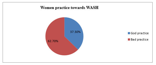 Merely 37.3% of the participants reported engaging in good WASH practices, whereas the majority of women 62.7%exhibited poor practices (Figure 4).