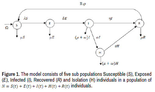 Based on the proposed compartmental mathematical model to describe the transmission dynamics of COVID-19. By taking into the account the localized well mixed population, there is demography, individual will become infected through direct contact with an infected individual and recovery individual will become infected again by corona virus [7]. The total population (N) is subdivided into five classes, these are, Susceptible (S), Exposed (E), Infected (I), Recovered (R) and Isolation (H). Also Death due to disease is represented by (ω), contact rate (λ), Natural mortality rate (μ), Probability of one infected individual (β), Rate at which infected individual become isolated (α), Rate at which insolated(H) individual become recovered (ε), The progression rate from exposed to infected (δ), Rate at which infectious(I) individual become recovered (η), Rate at which recovery individual become Susceptible (φ ). From compartmental diagram in Figure 1 above, the model take the following form of differential equations.