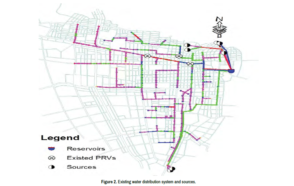 The present waters distribution network in Dilla town consists of 306 pipes, 278 junctions, and 7 pumps. The town is studied through a normally branched network made of a mixture of Galvanized Iron (GI) and PVC/HDPE pipes with sizes ranging from 300 mm to 25 mm starting from borehole to every consumer. Figure 2 showed the existing water distribution system and sources, a total estimated length of distribution lines was covered by about 37.7 km. As observed from the drawn distribution layout; there are different components of valves thus are a gate valve, check valve, air release valve, and pressure reducing valve or pressure gauge in sources was installed at a different location in existing WDS.