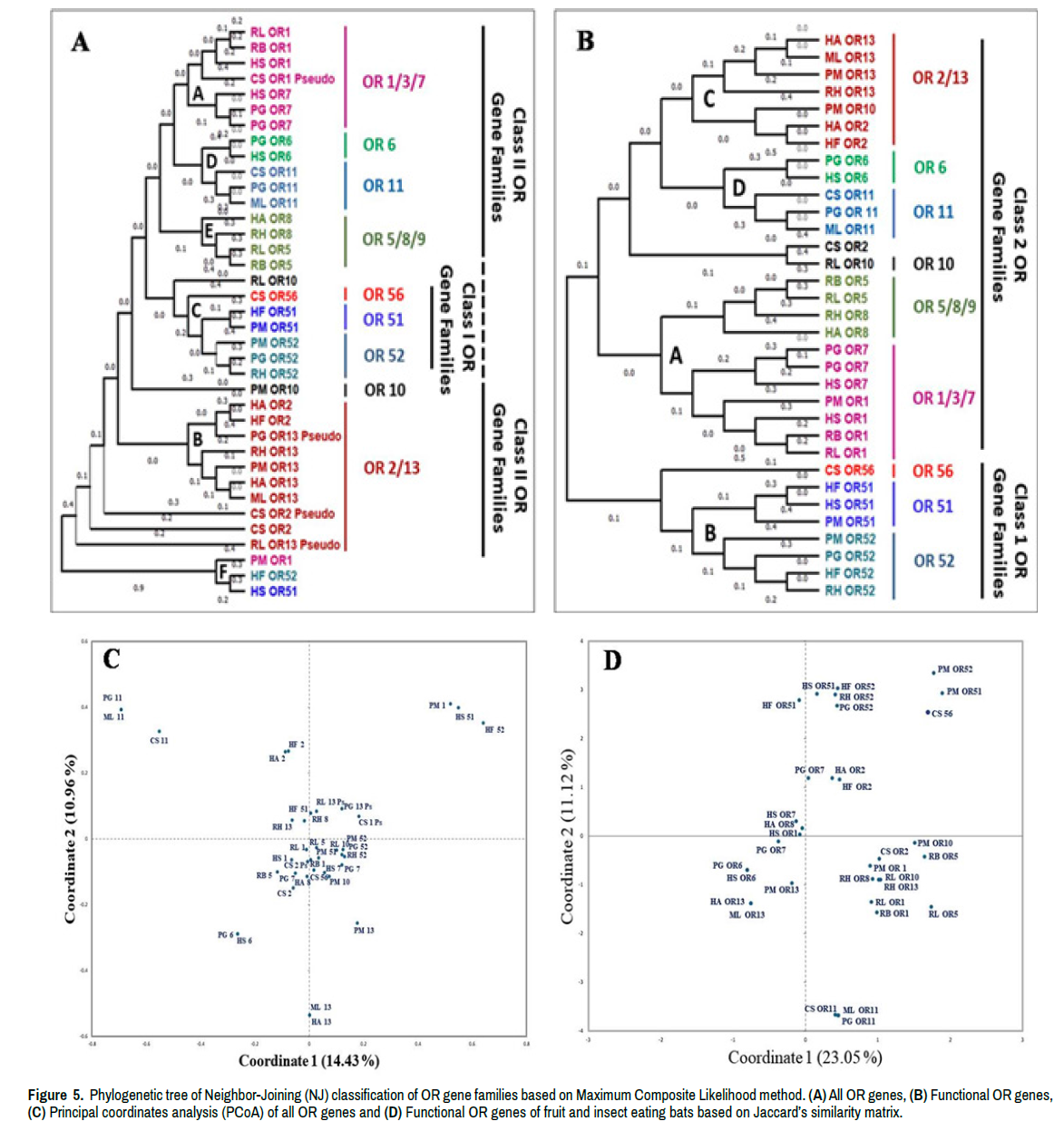 Figure 5. Phylogenetic tree of Neighbor-Joining (NJ) classification of OR gene families based on Maximum Composite Likelihood method. (A) All OR genes, (B) Functional OR genes, (C) Principal coordinates analysis (PCoA) of all OR genes and (D) Functional OR genes of fruit and insect eating bats based on Jaccard’s similarity matrix.