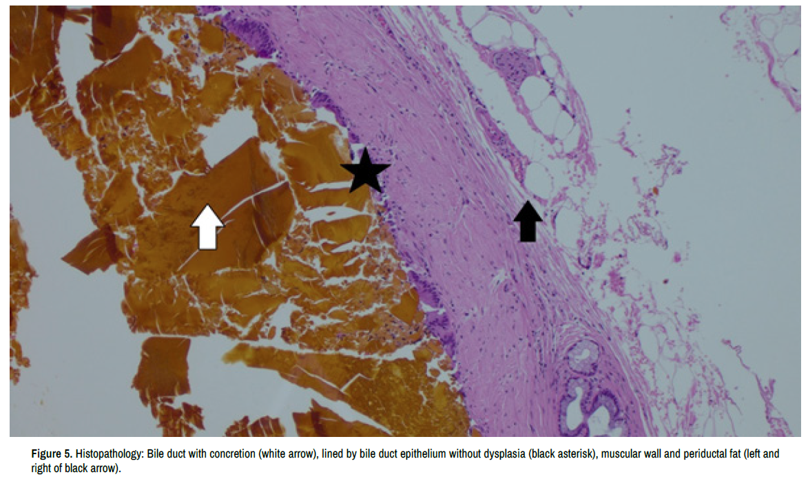 Cystic duct 3 cm long with 0.3 cm diameter with calculus, excision: bile duct portion with intraluminal bile concretion and focal mild chronic inflammation in the muscular wall layer. No signs for malignancy (Figures 4 and 5).
