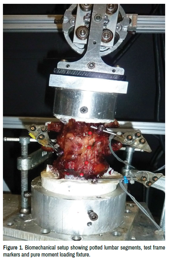 For each condition, the loading was applied to a single functional spinal unit in the superior-inferior orientation. Loading was applied via a servo-hydraulic test frame (858 Mini Bionix II; MTS) through a custom fixture for pure moment loading attached to the superior L2 vertebra (Figure 1). A preload of 7.5 Nm was applied three times for 45 seconds with 15 seconds of rest in between preloads for each specimen. During testing, each specimen underwent steadily increasing load from 0-7.5 Nm with 1.5 Nm increment increases every 45 seconds. Data was collected through the MFlexWin (custom) software and stored on a personal computer before being run through the DextrWin (custom) software to extract axis of rotation and translational data. Specimens were tested in the following conditions: intact, after nucleotomy, and after bead insertion.