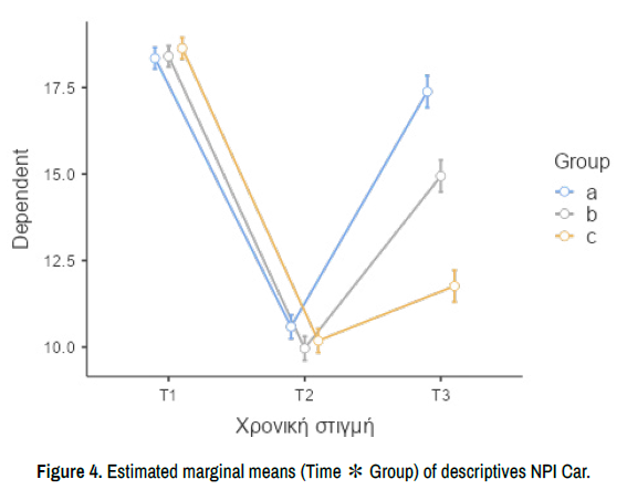 According to the results group C, which received both the multicomponent training programme and the psychoeducation had the best results in three domains: a) increased the cognitive abilities, b) decreased BPSD, and c) enhanced the general quality of life of the PwD and the caregivers, too. It is important to mention that all groups had positive results in all scales, which means that both these non-pharmacological interventions have beneficial effects in PwD and their caregivers. However, the combination of multicomponent exercise and psychoeducation has better results in T2 and T3. This is crucial because it is important to find interventions that can last over time. Nevertheless, in some cases the good results did not maintain over time, which means that in order to have the best outcomes of the interventions it is recommended to be applied in a daily or weekly schedule.