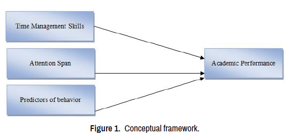 Depending on above postulates theory provides the variables for learning which are “attention span and behavior towards stimuli”. Whereas the earlier studies describe that “time management” is extraneous factor that affects the academic performance. In conclusion, the study consists of three independent variables “Attention Span, Predictors of behavior, Time Management” and one dependent variable that is “Academic performance”. Researcher aimed at calculating the academic performance of university students - who are exposed to social networking sites – through analysis of independent variables (Figure 1).