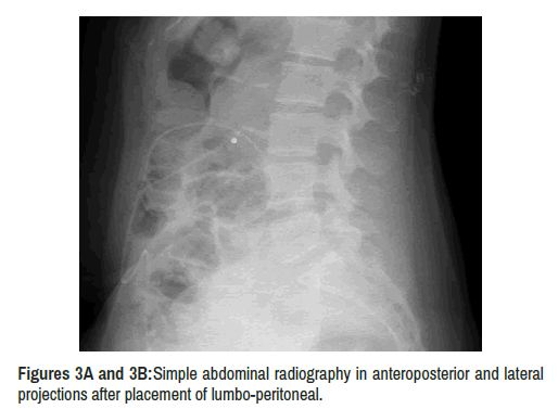 After evacuation of CSF through lumbar punctures, the patient experienced significant clinical improvement. Therefore, she was proposed to undergo surgical intervention by placing a lumbo-peritoneal shunt with programmable valves, Strata Medtronic Iberica SA (E45750), with correct postoperative evolution (Figure 3 a and b) [6] . Intracranial hypertension symptoms remitted. Subsequent ophthalmologic examination showed marked improvement of papilledema and the patient reported subjective visual improvement.