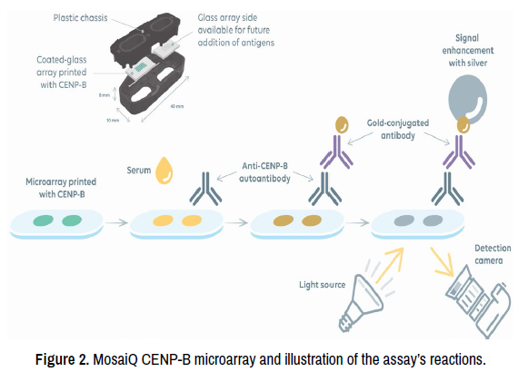 We report the performance characteristics of MosaiQ® CENP-B Microarray (CENP-B-MA) (AliveDx, Eysins, Switzerland), a new solid phase immunoassay microarray designed for use with the fully automated, continuous random access, high throughput MosaiQ System (AliveDx, Eysins, Switzerland), for qualitative serological detection of autoantibodies directed against CENP-B; compared with selected CE-marked devices.