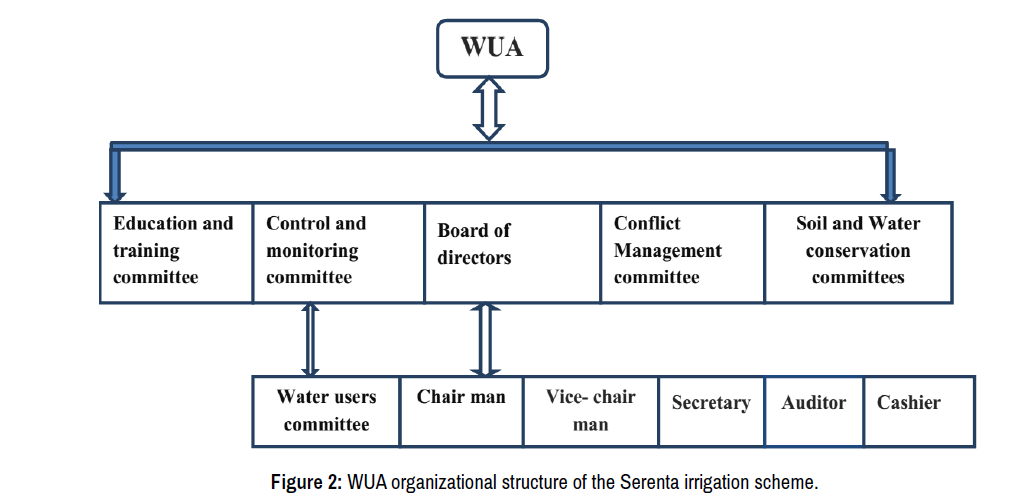 Water Users Association (WUA) are the most frequently recommended organizational form for management of irrigation scheme. The WUA are supposed to have full control over the irrigation infrastructures in irrigation scheme [4]. The Water Users Association (WUA) in Serenta Irrigation Scheme was established in January, 2017 with 72 members. The organization has its own bylaw (internal rule). Under this association there are five committees with different responsibilities (Figure 2).