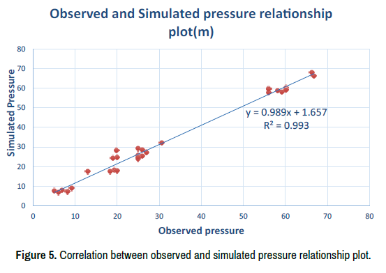 From the above Figure 5, the coefficient of determination (R2) value for peak demand and low demand time was 0.993. Since the value of R2 approaches to 1, that indicates there is a good correlation between fields measured pressure and simulated pressure.