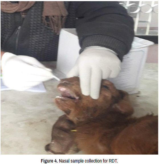 The diagnosis was done based on history, clinical signs, rapid diagnostic test (RDT), and post-mortem examination. Unvaccinated herds in endemic areas are at high risk of the disease which added up as a point of one of the causes of the development of the disease as the herd was not vaccinated with the PPR vaccine. Signs including coughing, soiled vent, severe diarrhea, necrotic stomatitis, and nasal and ocular discharge were seen in morbid goats indicating that the goats might be infected with the PPR virus. For confirmation, a post-mortem examination (Figure 1) and Rapid Diagnostic Test were conducted in the laboratory. A post-mortem examination revealed the following lesions: Advanced pneumonia with extensive dark red/ purple consolidated area with firm consistency in the cardiac lobe (Figure 2), enlarged mediastinal and mesenteric lymph nodes, hemorrhage in the small intestine (Figure 3), and necrotic stomatitis. However, the major pathognomonic lesion of PPR i.e., Zebra Marking in the caecum, colon, and rectum was not seen. So, Rapid Diagnostic Test was conducted using nasal and ocular discharges from morbid goats and dead goats (Figure 4) using superficial swabs. Sterile cotton swabs dipped into sterile PBS were inserted carefully into nasal orifices/ conjunctival sac, swirled around and the swab probably containing the antigen was used for the test. Within 20 minutes, the test showed a positive result for the PPR virus (Figure 5). Thus, clear history, clinical manifestations, post-mortem examination, and positive Rapid Diagnostic Test results lead to the conclusion that the herd was infected with the PPR virus. The studies by Abdollahpour G, et al. [12], El- Yuguda AD, et al. [13] and Kumar P, et al. [14] claimed that in 80-90% of cases, mesenteric lymph nodes and lungs are involved in a severe manner which differentiates this case from Rinderpest. Similarly, severe diarrhea and necrotic stomatitis observed, in this case, preclude CCPP (Contagious Caprine Pleuro Pneumonia) as the cause of the outbreak.