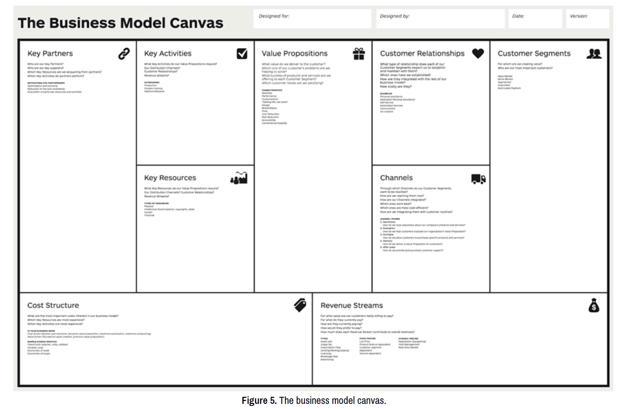 Such a document would present well to investors, look nice when bound in a three ring binder, but would be outdated soon after the ink dries. Rather, as engineers, our team found it helpful to view this document as a model rather than a plan. Schematics are written to be executed, but models are built to be tested. A robust model accounts for as many relevant inputs as possible, and is constructed with the expectation of augmentation over time. Models can be exploded to analyze the interaction of certain pieces and subsystems individually. Most importantly, models are built so that various inputs can be applied and subsequent results analyzed. Then, changes to the structure are made, the inputs are reapplied, and changes in the results are compared. As Steve Blank has often stated “no business plan survives first customer contact.” Therefore, plans should be written and executed with the intention to iteratively analyze the functionality of the model and augment as necessary to improve effectiveness and efficiency. Our team utilizes the Business Model Canvas (Figure 5) developed by Osterwalder, Pigneurand Clark [26] as a canvas for our model creation and iteration. The Business Model Canvas is also a valuable to tool sketch out the business model before delving into each topic more in a traditional business plan.