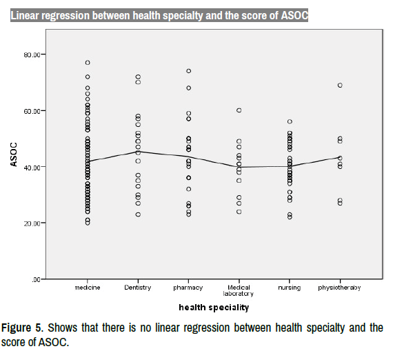 Figure 5.Shows that there is no linear regression between health specialty and the score of ASOC.
