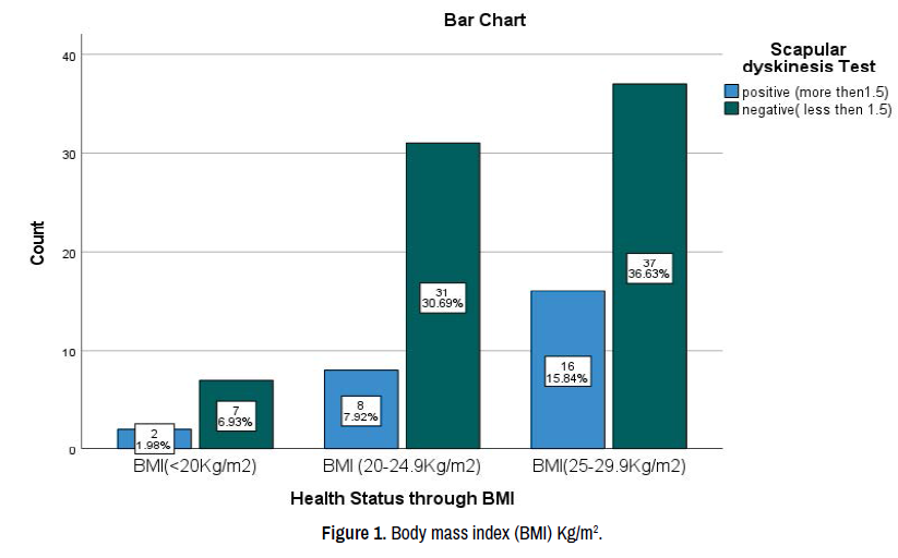 Out of total both genders it was seen that 26(25.7) had positive scapular dyskinesis. The result was obtained by the lateral scapular slide test and the positive participants had more than 1.5 cm value and 75(74.3%) had negative they had less than 1.5 cm as shown in Table 3. Prevalence of scapular dyskinesis was found about 74.26% out of total and difference was statistically with p-value of 0.000 as shown in Table 3 and the association between the health status through BMI and scapular dyskinesia in which, out of total, 2(1.98%) was in underweight having positive result and, 8(7.92%) in normal weight and 16(15.84%) in over weight were seen as presented in Figure 1.