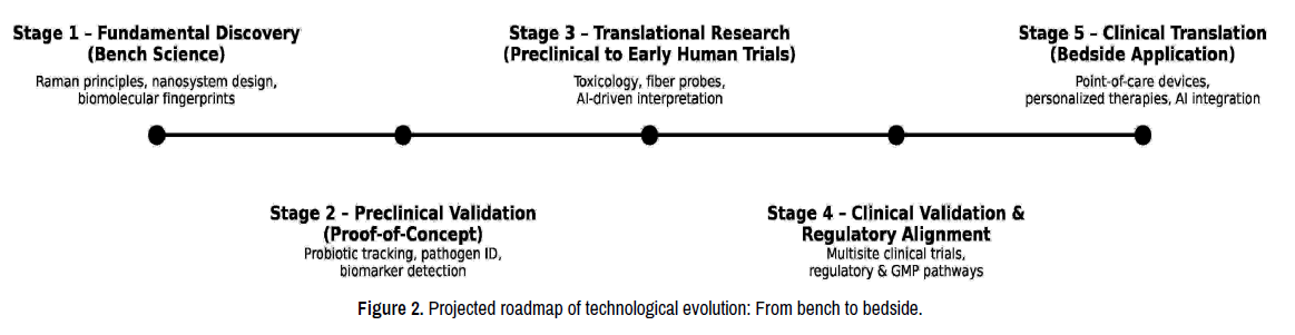 Going forward, technical advances should include hybrid strategies that integrate Near-InfraRed (NIR) excitation with optimized SERS labels, alongside adaptive optical approaches and adherence to evidence-based laser exposure guidelines. While NIR optimization provides partial solutions, deeper integration of Raman spectroscopy with complementary modalities such as photoacoustic imaging and optical coherence tomography could enhance tissue penetration and diagnostic accuracy [74]. Advances in miniaturized fiber-optic probes, particularly those incorporating multi-core designs, open new possibilities for endoscopic and intraoperative applications. Additionally, algorithmic progress in AI-driven noise reduction and adaptive optics may allow useful signals to be extracted even under challenging scattering conditions [75]. Following a clearly defined roadmap to technological evolution, wearable or implantable Raman sensors could, in the future, enable continuous, real-time monitoring of probiotics, pathogens, as well as biochemical changes deep within tissues (Figure 2).