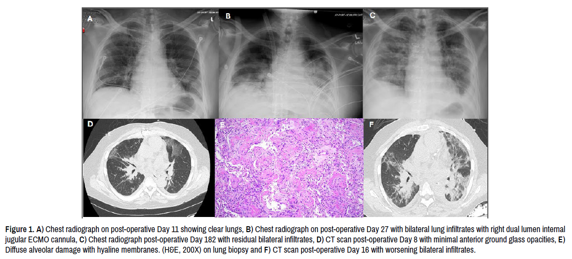 Figure 1. A) Chest radiograph on post-operative Day 11 showing clear lungs, B) Chest radiograph on post-operative Day 27 with bilateral lung infiltrates with right dual lumen internal jugular ECMO cannula, C) Chest radiograph post-operative Day 182 with residual bilateral infiltrates, D) CT scan post-operative Day 8 with minimal anterior ground glass opacities, E) Diffuse alveolar damage with hyaline membranes. (H&E, 200X) on lung biopsy and F) CT scan post-operative Day 16 with worsening bilateral infiltrates.