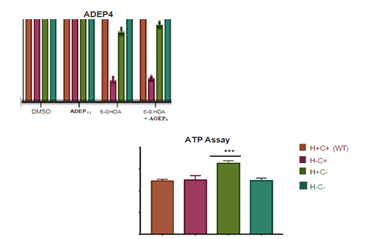 ATP production was determined via ATP assay nominalized by the measurement of protein levels using the Bradford method. Likewise, in the cell viability assay, the ATP assay also displayed a concentration dependent reduction in energy production among the different genotypes and reflected both the cell viability and the metabolic status of the cells. The results illustrated that depletion of HtrA2 significantly increased susceptibility to drug treatment as shown in (Figure 7). Compared to the vehicle control (DMSO), the loss of energy production was significantly higher in the HtrA2 KO/CHOP genotype treated only with 6-OHD A (p<0.0001).