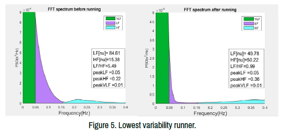It is also possible to compare several athletes, in which case they should be sprinters - short-distance runners and perform the same sports load (running two sections of two hundred meters). After recording the time intervals from the holter, a spectral method is applied that calculates the frequency components. The LF/HF ratio can be used to determine which part of the ANS is dominant. If the value of the second record is lower, it follows that the parasympathetic system is prevalentand conversely, if the ratio is greater, it follows that the sympathetic system is more active. The percentage ratio between the averaged spectral frequencies of the five is shown in Figure 4 (before and after running). After an analysis of several competitors, it is possible to obtain a difference between the heart rates of each of them, which is due to the degree of fatigue from the workout. The VLF component of the analysis corresponds to the sympathovagus balance and has a unique characteristic. Two of the participants in this study produced very interesting results. One showed very low post-run variabilityand the other showed high resting and postrun sympathetic indices. It is assumed that the first athlete shows the most significant resistance and struggle against "danger". Its dominant component during rest and after running is VLF. The other subject had a dominant LF component before and after running. Some of the studied parameters have statistical significance, determined by t-test, since the p-value is less than 0.05. These are the normalized units of Table 1: LF[nu], HF[nu]. LF/HF ratio has no statistical significance - NS. The indicators are presented in normalized units, where it is observed that the low frequencies and the ratio are lower after physical exercise. On the other hand, the high frequency has lower indicators before running. Figure 5 shows the FFT plot of the low variability sprinter. In Figure 6, the subject with the dominant sympathetic nervous system is at rest and after the run. The physical load determined the coach, who is 58 years old and continue, to compete and win medals for Bulgaria on Figure 7. The fastest was a sprinter, 18 years old, who ran the distances with ease (Figures 1-7) and (Table 1).