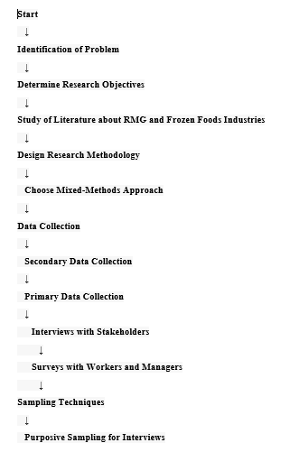 This chapter has detailed the research design, data collection methods, sampling techniques, analytical approaches, ethical considerations, and limitations of the study. The mixed-methods approach, combining quantitative and qualitative data, provides a comprehensive framework to explore the contributions of the RMG and frozen food industries to the Bangladeshi national economy. The following chapters will present the findings and discuss their implications in detail. The research flow can be seen in Figure 1.