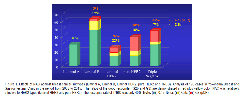 Figure 1. Effects of NAC against breast cancer subtypes (luminal A, luminal B, luminal HER2, pure HER2 and TNBC). Analysis of 196 cases in Yokohama Breast and