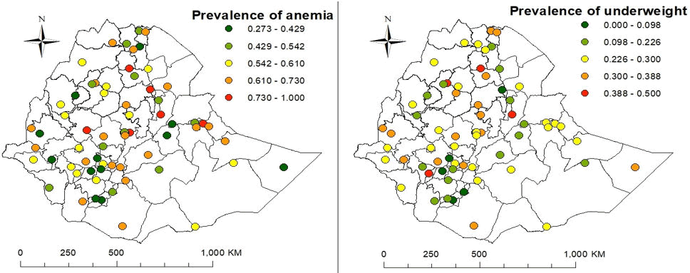 Spatial distribution of anemia and underweight: In this study, about 69 administrative zones were used from EDHS 2016 to analyze the spatial distribution of the status of child anemia and underweight and the rest three couldn’t be used due to the data on anemia and underweight status was not collected among those zones. Each point on the map was characterized by the prevalence of anemia and underweight in each zone. The green color indicates the zones with a low distribution of anemia and underweight, whereas the red color indicates zones with a high distribution of anemia and underweight (Figure 1).