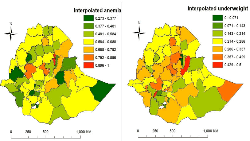The spatial hot spot analysis evidenced that West Harerghe, South Gondar, East Gojam, Zone 3AF, Oromia zone, Zone 5AF, Shinile, Dire Dawa, Hundene and West Gojam administrative zones were a high-risk areas of anemia, and Awi administrative zone was a highrisk area of underweight.