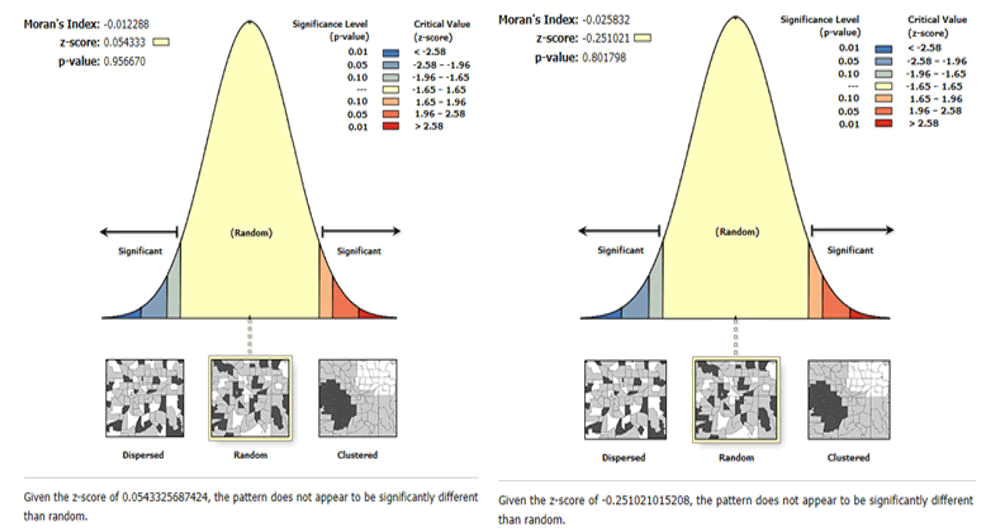 In spatial analysis, the special autocorrelation between areas was conducted using global Moran’s I and local Moran’s I. Global Moran’s I quantify the spatial autocorrelation as a whole, whereas Local Moran’s I measure the degree of spatial autocorrelation at each specific location. Global Moran's I was applied to measure spatial autocorrelation related to feature locations and feature values simultaneously.