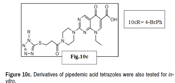Derivatives of pipedemic acid tetrazoles were also tested for in-vitro anti proliferative activity against cervix (SiHa), breast (MDA-MB-231) and pancreatic carcinoma cell lines by the sulforhodamine B (SRB) assay which was found more potent than the corresponding ciprofloxacin analogs [16] (Figure 10c).