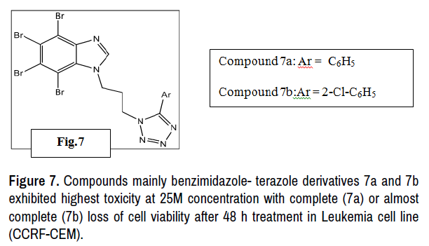 E. Lukowska Chojnacka, et al. synthesized some series of new benzimidazole and benzotriazole derivatives containing a tetrazole moiety and cytotoxicity against human T-cell lymphoblast (CCRF-CEM) and breast adenocarcinoma (MCF-7) cell lines were evaluated using MTT assay. Two compounds mainly benzimidazole- terazole derivatives 7a and 7b exhibited highest toxicity at 25M concentration with complete (7a) or almost complete (7b) loss of cell viability after 48 h treatment in Leukemia cell line (CCRF-CEM). In case of Human breast adenocarcinoma cell line(MCF-7), compound 7aand 7b exhibited lower cytotoxicity than CCRF-CEM cell line but with higher compound concentration and prolongation of treatment time to 48 hours significantly decrease of cell viability was observed.Hence the introduction of aryl-tetrazole moiety into the alkyl side chain of the benzimidazole or benzotriazole resulted in higher cytotoxicity as compared to the nonsubstituted Tetrabromobenzimidazole (TBBi) and Tetrabromobenztriazole (TBBt) [14] (Figure 7).