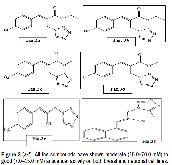 Chebolu Naga et al. synthesized some new tetrazole derivatives by Baylis– Hillman allyl amines and they were screened against selected human cancer cell linesof liver carcinoma (Hep-G2), lung adenocarcinoma (A-549), breast (MDA-MB-231), prostate carcinoma (DU-145), neuroblastoma (SKN- SH) origin. Sulforhodamine B(SRB) colometric assay method was used to evaluate the IC50.The compounds 3a,3c,3e and 3f displayed the highest in vitro anticancer activity (1.0–4.0 mM) on both liver carcinoma (Hep G2) and lung adenocarcinoma (A 549) cell lines. Compounds 3b, 3c, 3d and 3f displayed significant activity (4.0–7.0mM) against prostate (DU 145) cancer cell line. All the compounds have shown moderate (15.0–70.0 mM) to good (7.0–15.0mM) anticancer activity on both breast and neuronal cell lines [10] (Figure 3).