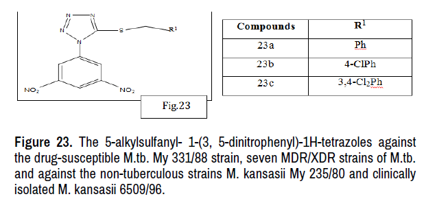 Karabanovich G. et al. synthesized a series of novel 5-alkylsulfanyl-1-(3,5- dinitrophenyl)-1Htetrazoles. The derivatives with hydroxy, acetoxy, amino and acetamido groups instead of one of the nitro groups as well as derivatives with one trifluoromethyl group were prepared. The compounds were evaluated for the in vitro antimycobacterial activity which revealed very good activities for the 5-alkylsulfanyl- 1-(3,5-dinitrophenyl)-1H-tetrazoles against the drug-susceptible M.tb. My 331/88 strain, seven MDR/XDR strains of M.tb. and against the non-tuberculous strains M. kansasii My 235/80 and clinically isolated M. kansasii 6509/96. The direct attachment of the 3,5-dinitrophenyl moiety to the tetrazole nitrogen in the compounds of thatseries led to 2 - 4 times higher antimycobacterial efficiencies against M.tb. and strains of M. kansasii as compared to the parent compounds 1-alkyl/aryl-5- [(3,5- dinitrobenzyl)sulfanyl]-1H-tetrazoles. The MIC values were in the range of 0.25 - 1 μM, of the compounds of that series against M.tb [31] (Figure 23).