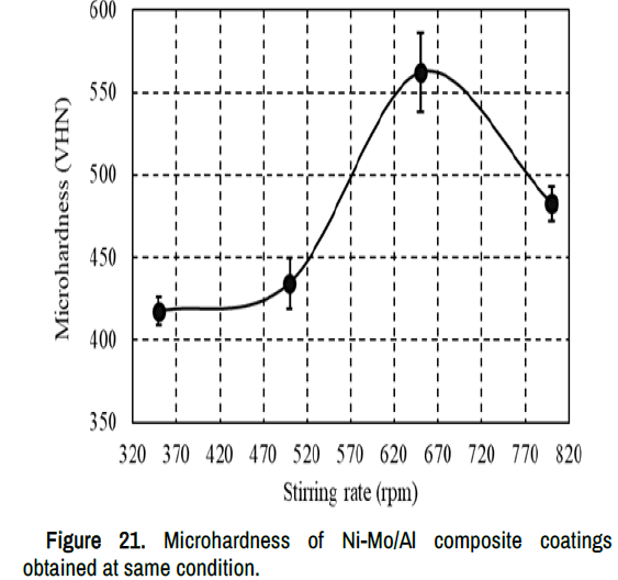 The microhardness of Ni-Mo/Al composite coatings obtained at different stirring rates are shown in Table 2 and Figure 21.