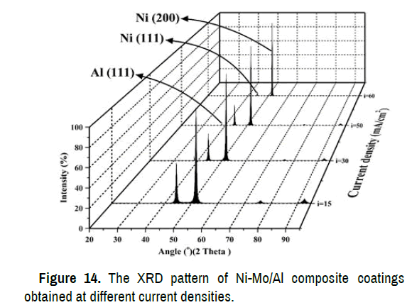 According to this interpretation, the grain coarsening by increasing current density can be considered as the main reason for decreasing wear resistance and microhardness and increasing roughness. Consequently, it seems that the grain size of coatings is simultaneously affected by current density and Al particles in which each of them has opposite effect on the grain size. It means that grain size is increased and decreased by increasing current density and Al particles content by two different rates, respectively. The rate of grain coarsening due to increasing current density is more than that of grain refining. There are evidences which show that the rate of grain coarsening is the predominant mechanism and can be considered as follow: The first evidence is that the peak width increases by increasing the current density, as is seen in Figure 14. Careful examination shows that the XRD peaks of Ni-Mo/Al composite coatings at low current density e.g. 15 mA/cm2 is wider than that of the coating obtained at high current density e.g. 60 mA/cm2.