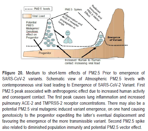Figure 20. Medium to short-term effects of PM2.5 Prior to emergence of SARS-CoV-2 variants. Schematic view of Atmospheric PM2.5 levels with contemporaneous viral load leading to Emergence of SARS-CoV-2 Variant. First PM2.5 peak associated with anthropogenic effect due to increased human activity and consequent contact. The first peak causes lung inflammation and increased pulmonary ACE-2 and TMPRSS-2 receptor concentrations. There may also be a potential PM2.5 viral mutagenic induced variant emergence, on one hand causing genotoxicity to the progenitor expediting the latter’s eventual displacement and favouring the emergence of the more transmissible variant. Second PM2.5 spike also related to diminished population immunity and potential PM2.5 vector effect.