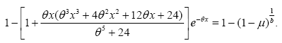 where θ is the scale parameter of the Rani distribution denoted R(θ). The latter is a mixture of exponential (θ) and gamma (5,θ) with mixing proportion